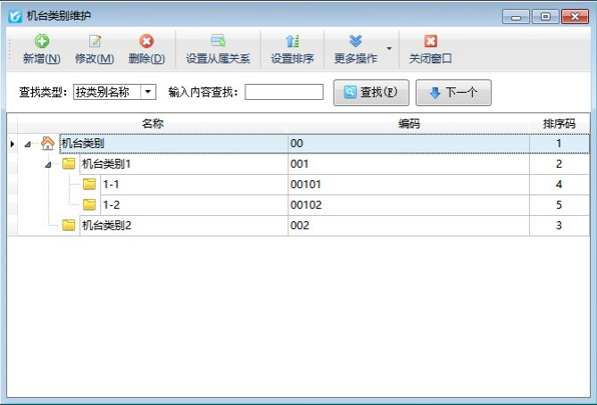 機臺類別:點工具欄中的“機臺類別”按鈕,可對機臺的分類進行維護。