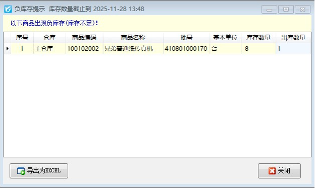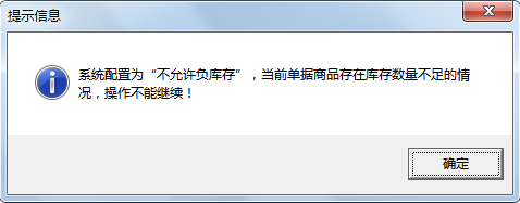 ????啟用“負庫存提示”時,如果單據明細中的商品出現負庫存,則軟件彈出如下提示窗口。如果不允許負庫存出庫,則軟件彈出審核失敗,庫存數量不足!