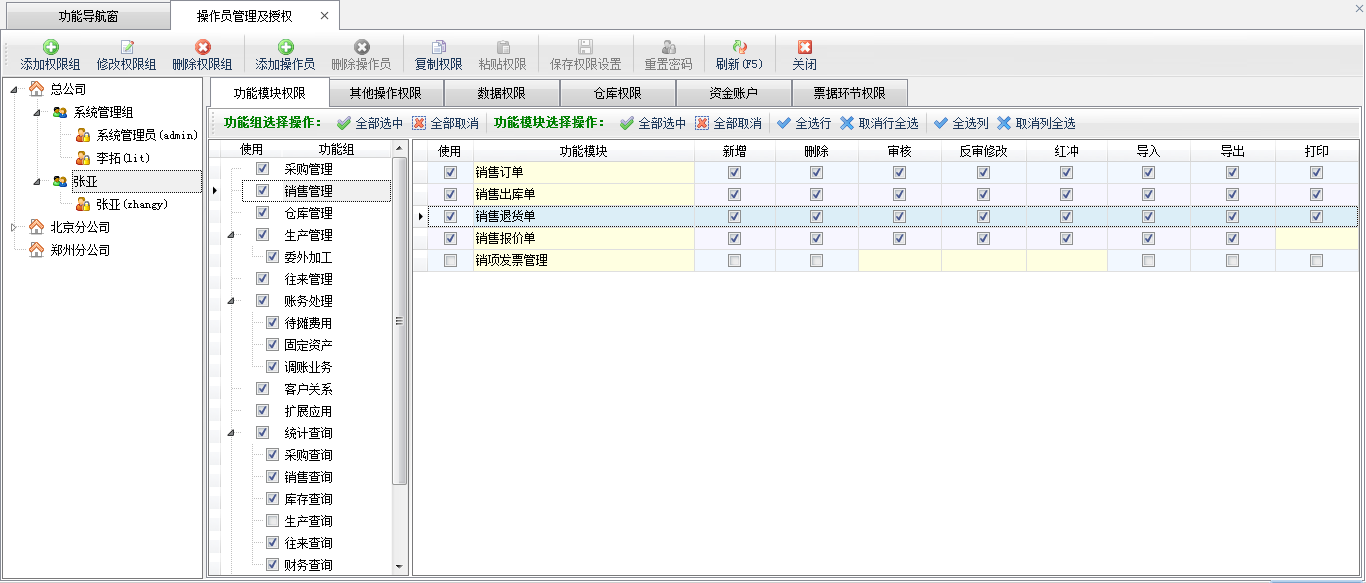 ????① 設置功能模塊權限的時候,注意打勾選擇“使用”后,還需要設置詳細的操作權限(如新增、刪除、審核、反審修改、紅沖、導入、導出、打印等),如果不設置詳細的模塊操作權限,則只能進入功能模塊,但無法執行任何操作。