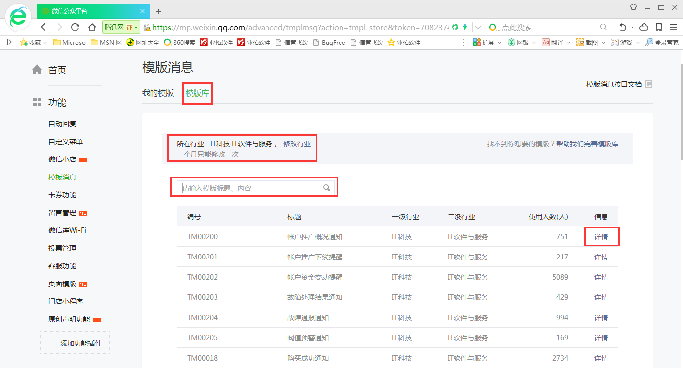 ????在模板庫中點擊“詳情”,在詳情介紹下進行添加微信消息模板。