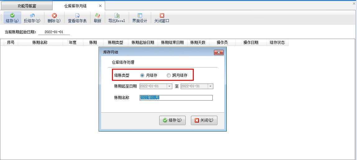 ????庫存月結功能支持按月或者跨月多業(yè)務進行結存操作,如下圖所示: