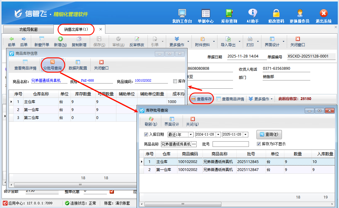 ????銷售開單界面“查看庫存”可查看商品在不同倉庫的庫存數量、可用數量、成本均價、庫存金額等,批號商品可點擊“分批號查詢”,會彈出商品不同批號在不同倉庫的庫存數量,如下圖所示:
