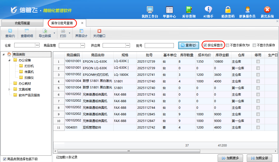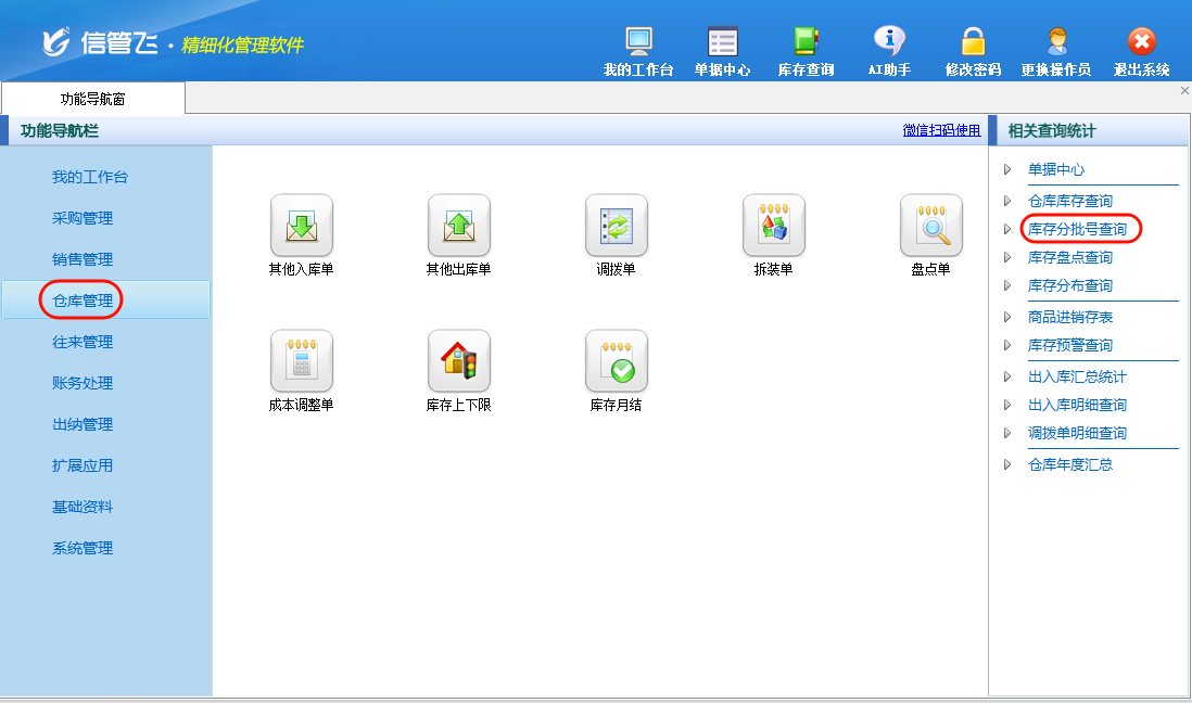 ????功能導航窗選擇“倉庫管理”,倉庫管理界面右側相關統計查詢中打開“庫存分批號查詢”。庫存分批號查詢界面顯示所有批號商品的庫存數量,默認按倉庫進行顯示,如下圖所示: