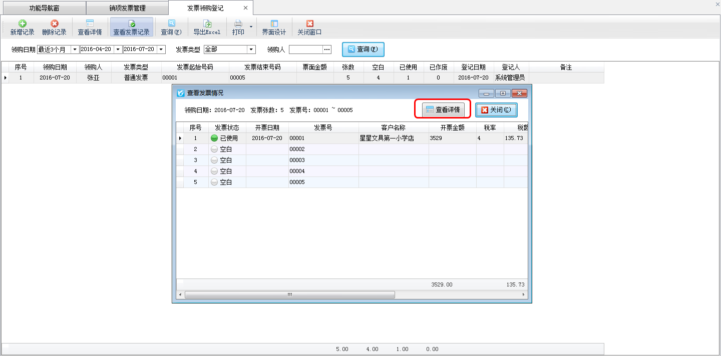 查看詳情:選中一條領(lǐng)購(gòu)記錄,點(diǎn)擊“查看詳情”按鈕,可以查看該條記錄的領(lǐng)購(gòu)登記信息。