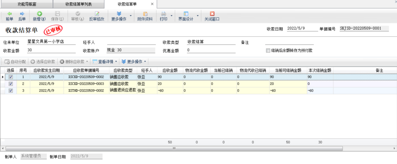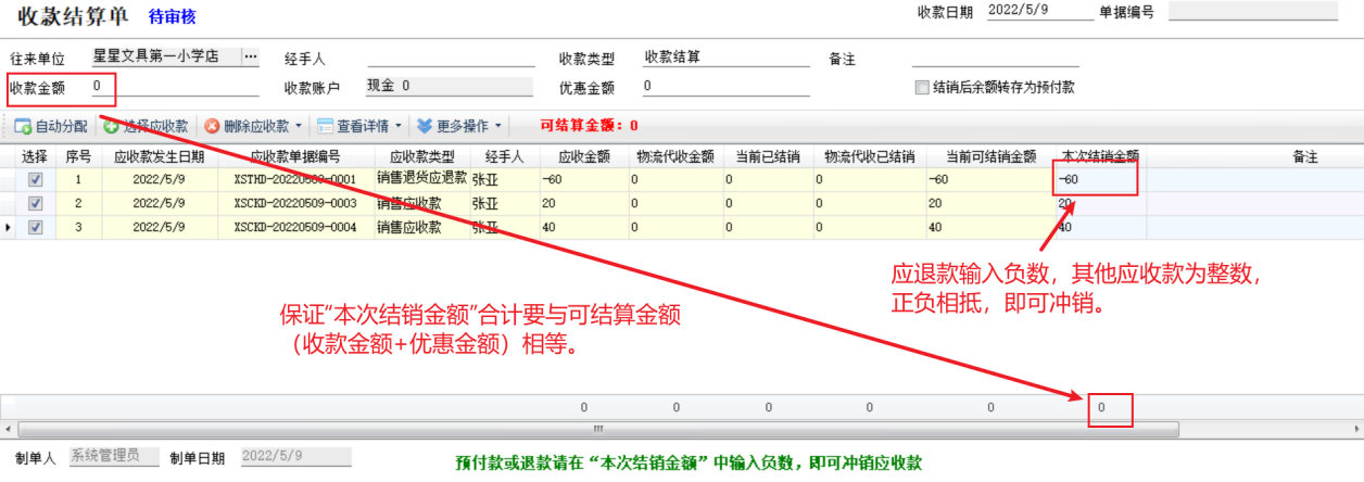 ????① 單據(jù)明細(xì)中“本次結(jié)銷金額”的合計(jì)金額,必須等于可結(jié)銷金額(收款金額 + 優(yōu)惠金額),否則無法保存收款結(jié)算單。