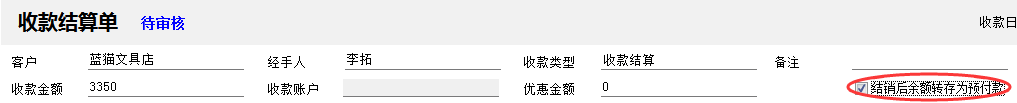 ????部分情況下,客戶付款會(huì)多出一些作為預(yù)付款(比如此前欠款 4960 元,客戶為了打款方便,直接給我們付款 5000 元),這種情況可以打勾選擇“結(jié)銷余額轉(zhuǎn)為預(yù)付款”復(fù)選框,軟件會(huì)自動(dòng)生成相應(yīng)的收款結(jié)算單(其收款類型為“客戶預(yù)付款”,如上例其金額為 40 元)。