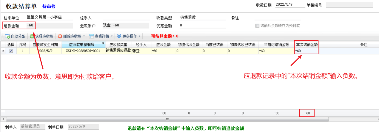 ????② 銷售應(yīng)退款記錄的“本次結(jié)銷金額”需要輸入負(fù)數(shù),這樣可以沖抵其他應(yīng)收款記錄(正負(fù)可以抵銷)。使用應(yīng)退款沖銷應(yīng)收款,如果沒有收到新款項(xiàng),可以不錄入本次收款金額,這樣可沖抵的金額即為應(yīng)退款的金額(本次結(jié)銷金額的合計(jì)為 0)。