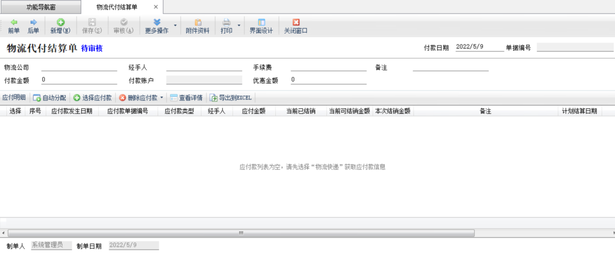 ????物流運(yùn)費(fèi)結(jié)算單的操作與付款結(jié)算單基本一致,這里不再詳述。