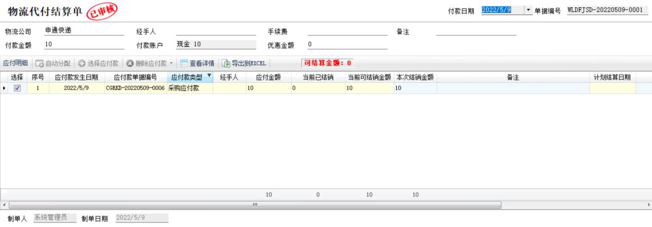 ????物流代付結(jié)算單的操作與付款結(jié)算單基本一致,這里不再詳述。