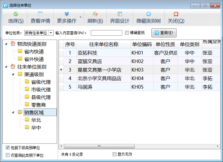 往來單位:點擊選擇往來單位按鈕,可以從往來單位庫中選擇,如下圖所示: