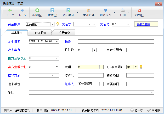 ????在新增或修改憑證時,系統(tǒng)支持“轉(zhuǎn)記憑證”功能,用于處理存款、取款、轉(zhuǎn)帳等涉及多個帳戶的憑證錄入,方便用戶操作,減少重復錄入。