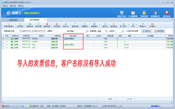 在企業的采購與銷售流程中,發票管理至關重要。信管飛出納記賬軟件憑借其強大的發票管理功能,助力企業高效、精準地處理發票信息。另外,軟件支持導入Excel快速導入發票信息。有用戶在軟件內導出銷項發票Excel模版,維護數據后導入軟件,客戶名稱這一項導入不成功,如下圖所示。