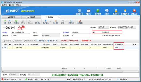 在付款結算單界面單獨結算這一筆采購預付款的賬單,付款金額錄入-50000元,可以在備注項錄入供應商退回以便后續查詢,如下圖所示: