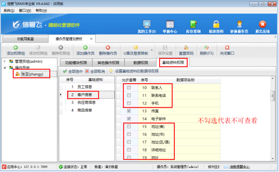 在企業(yè)進(jìn)銷存管理中,客戶、供應(yīng)商、商品等基礎(chǔ)資料是核心資產(chǎn),其中往往包含大量敏感信息,例如客戶聯(lián)系方式、地址、業(yè)務(wù)歸屬等。如果這些信息對(duì)所有操作員完全開放,可能導(dǎo)致數(shù)據(jù)泄露、信息濫用等風(fēng)險(xiǎn)。