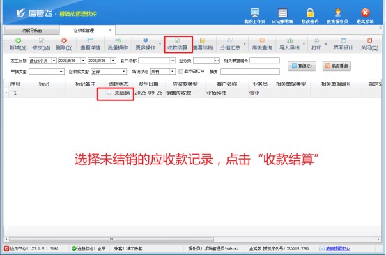 選擇應(yīng)收款并進(jìn)行結(jié)算:在應(yīng)收款列表中,選擇一條未結(jié)銷(xiāo)的應(yīng)收款,點(diǎn)擊工具欄的“收款結(jié)算”按鈕,系統(tǒng)將迅速?gòu)棾鍪湛罱Y(jié)算單界面。