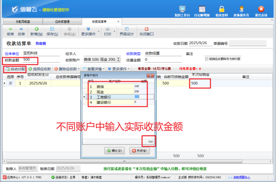 多賬戶(hù)輸入與自動(dòng)分配:在收款結(jié)算單界面,打開(kāi)收款賬戶(hù)選項(xiàng)。在多資金賬戶(hù)中分別輸入實(shí)際收款金額。只需確保多個(gè)賬戶(hù)的收款金額相加等于本筆應(yīng)收款金額,軟件便會(huì)自動(dòng)進(jìn)行分配,無(wú)需您手動(dòng)計(jì)算與調(diào)整,大大提高了結(jié)算的準(zhǔn)確性與效率。