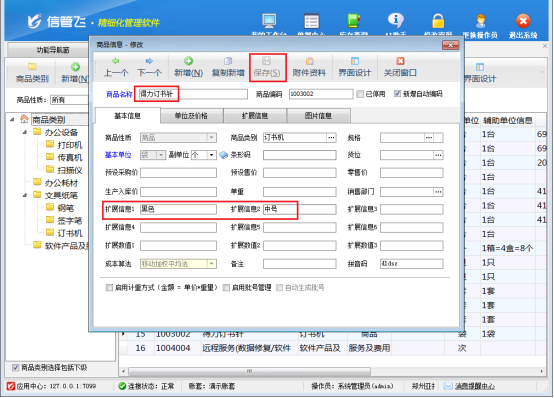 點擊“基礎資料”—“商品信息”,在界面中修改商品信息,輸入擴展信息1和2的內容并保存,讓每個商品都有詳細擴展信息。