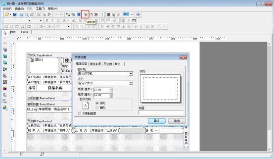 在單據開單界面選擇打印—》打印格式設計—》設計格式,進入打印模板的設計器界面,菜單欄設置中點擊添加頁,可以設置添加頁面的大小和打印方向,如下圖所示: