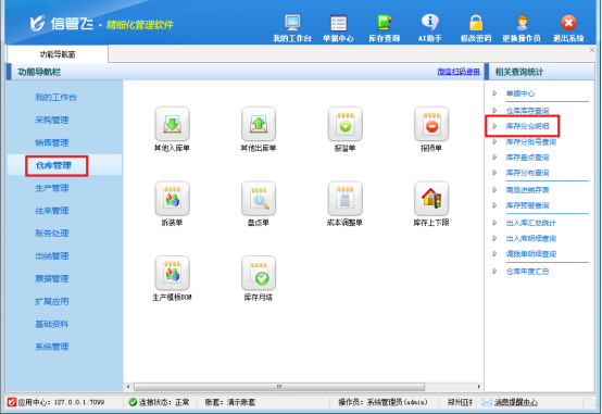 完成參數設置后,退出軟件并重新登錄。此時,您會發現倉庫管理右側的查詢統計處已經新增了“庫存分倉明細”選項。點擊進入該界面,您將驚喜地發現,商品庫存可以按照不同倉庫清晰顯示,每一個倉庫的庫存數量、品種等信息都一目了然。無論是日常的庫存盤點,還是緊急的貨物調配,您都能在這個界面上快速獲取所需信息,查詢過程方便又高效。