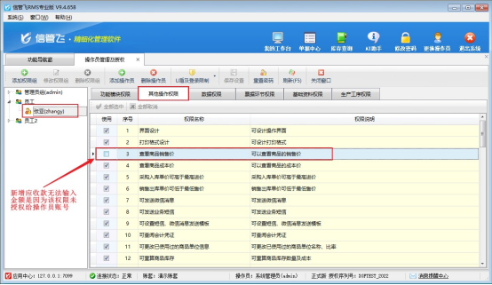 信管飛RMS軟件通過操作員權限控制功能模塊訪問權限。若操作員賬號未被分配“查看商品銷售價”的操作權限,將導致金額字段不可編輯。