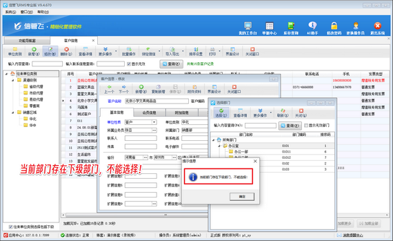 有用戶在使用信管飛 RMS過程中,遇到這樣的問題:修改客戶信息選擇部門時,系統提示 “當前部門存在下級部門,不能選擇”,導致操作無法繼續。這一提示并非故障,而是系統參數控制帶來的使用限制。